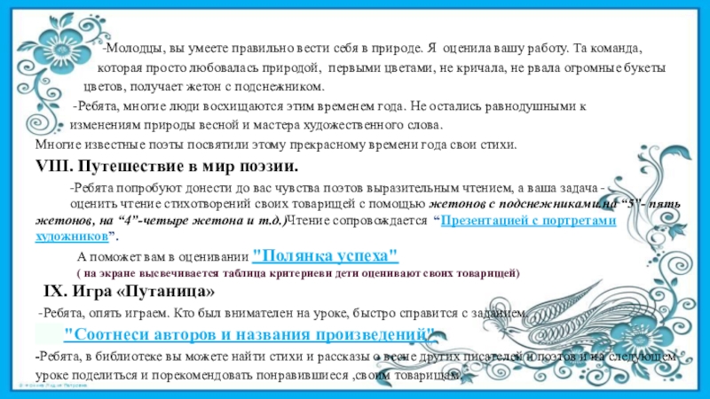 оценить чтение стихотворений своих товарищей с помощью жетонов с подснежниками.на “5”- пять жетонов, на “4”-четыре жетона и т.д.)Чтение сопровождается “Презентацией с портретами художников”.