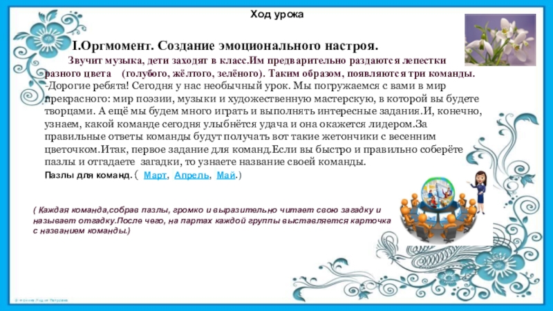 -Дорогие ребята! Сегодня у нас необычный урок. Мы погружаемся с вами в мир прекрасного: мир поэзии, музыки и художественную мастерскую, в которой вы будете творцами. А ещё мы будем много играть и выполнять интересные задания.И, конечно, узнаем, какой команде сегодня улыбнётся удача и она окажется лидером.За правильные ответы команды будут получать вот такие жетончики с весенним цветочком.Итак, первое задание для команд.Если вы быстро и правильно соберёте пазлы и отгадаете загадки, то узнаете название своей команды.