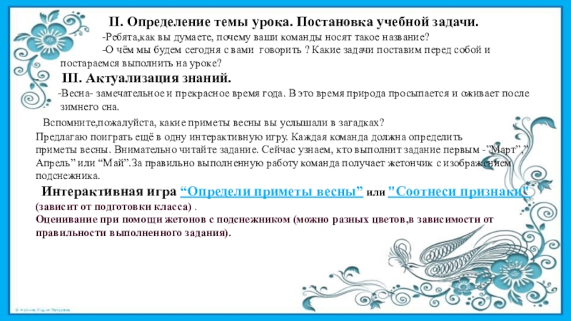Интерактивная игра “Определи приметы весны” или "Соотнеси признаки" (зависит от подготовки класса) .