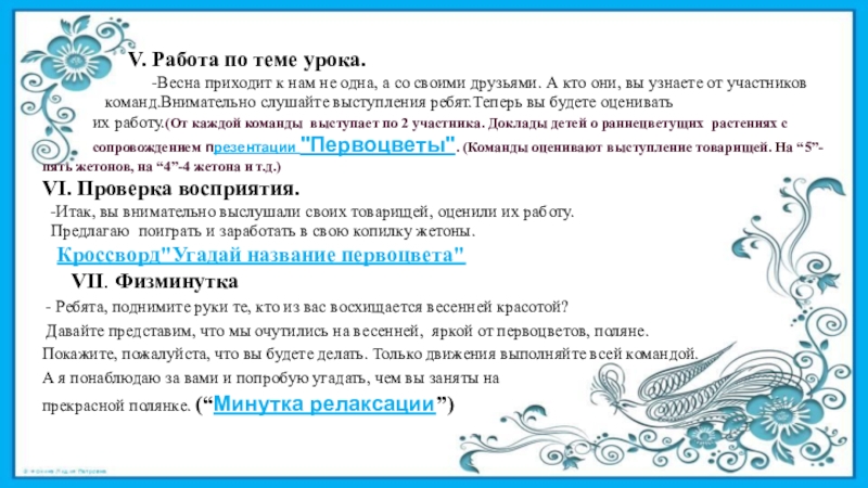 сопровождением презентации "Первоцветы". (Команды оценивают выступление товарищей. На “5”- пять жетонов, на “4”-4 жетона и т.д.)