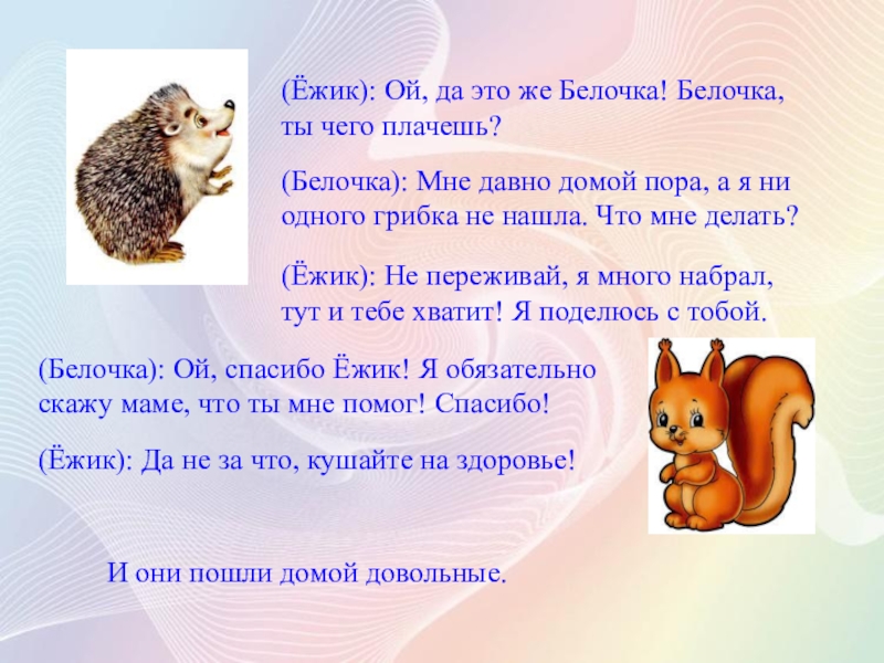 (Белочка): Ой, спасибо Ёжик! Я обязательно скажу маме, что ты мне помог! Спасибо!