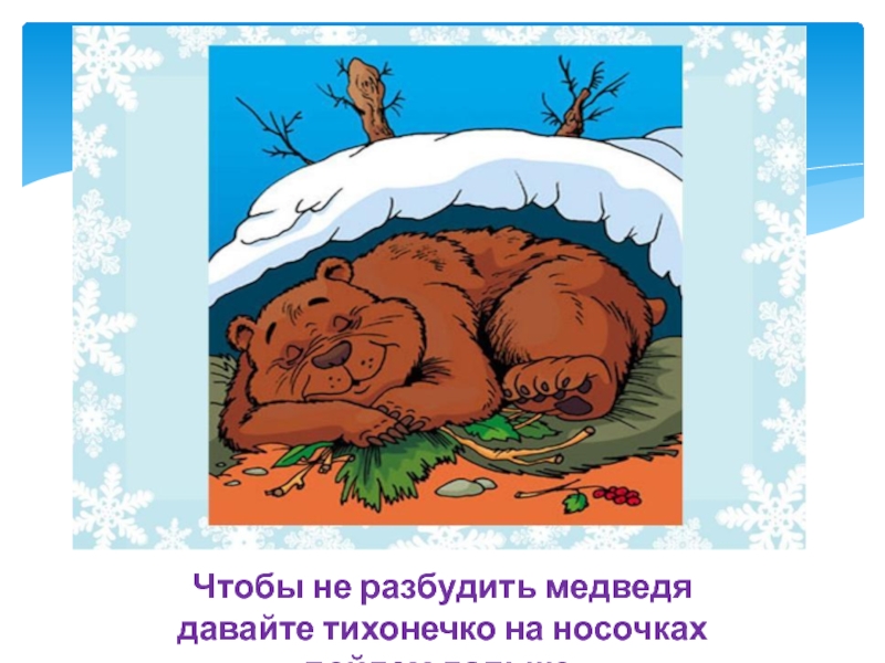 Слайд 8Чтобы не разбудить медведя давайте тихонечко на носочках пойдем дальше.