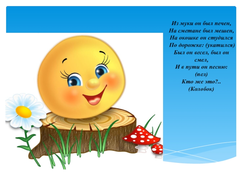 Из муки он был печен,На сметане был мешен,На окошке он студилсяПо дорожке: (укатился)Был он весел, был он смел,И в пути он песню: (пел)Кто же это?.. (Колобок)