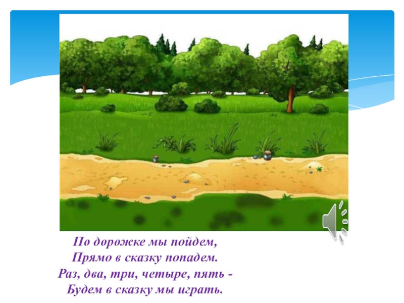 По дорожке мы пойдем,Прямо в сказку попадем.Раз, два, три, четыре, пять -Будем в сказку мы играть.