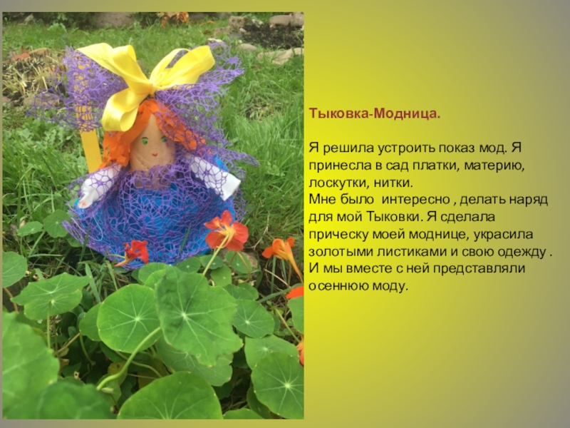 Я взяла тыковку и сделала ей из травинок прическу, а из листьев накидку.