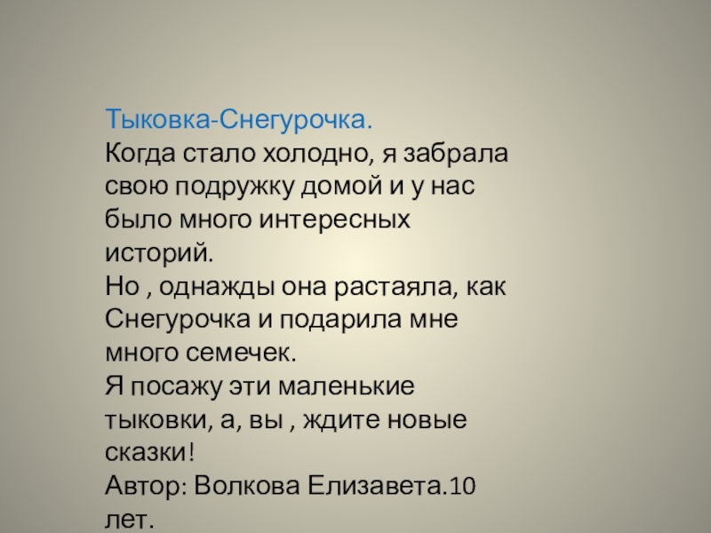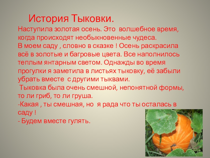 История Тыковки.Наступила золотая осень. Это волшебное время, когда происходят необыкновенные чудеса.В моем саду , словно в сказке