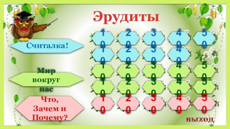 102030405010203040102030405010203040501020304050Что, Зачем и Почему?Мир вокруг насЭрудиты Считалка!