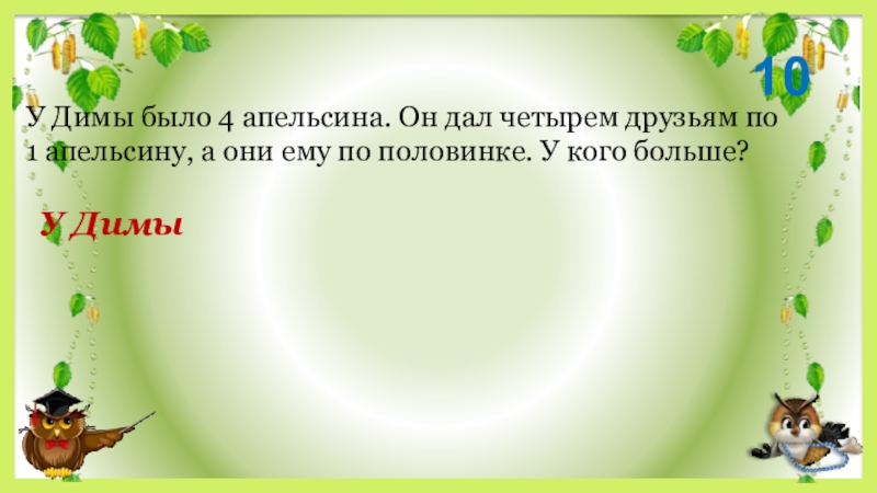 У Димы было 4 апельсина. Он дал четырем друзьям по