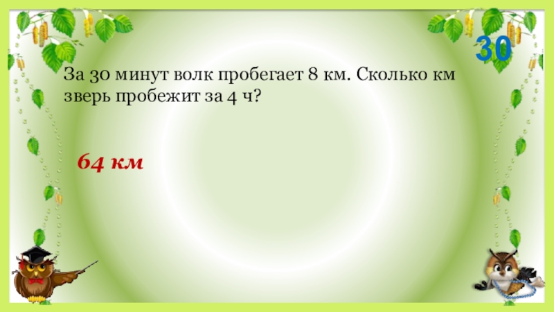 3064 кмЗа 30 минут волк пробегает 8 км. Сколько км зверь пробежит за 4 ч?