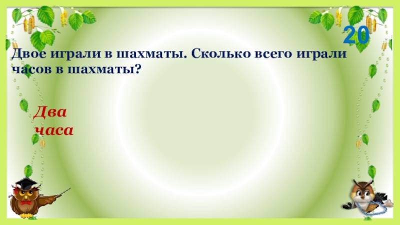 Два часа20Двое играли в шахматы. Сколько всего играли часов в шахматы?