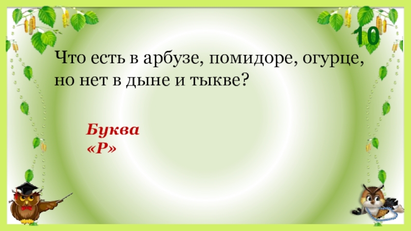 10Буква «Р»Что есть в арбузе, помидоре, огурце, но нет в дыне и тыкве?