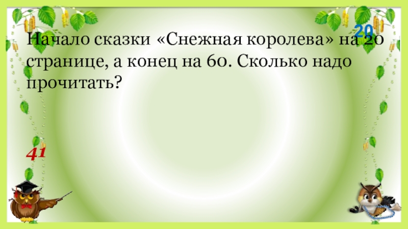 2041Начало сказки «Снежная королева» на 20 странице, а конец на 60. Сколько надо прочитать?