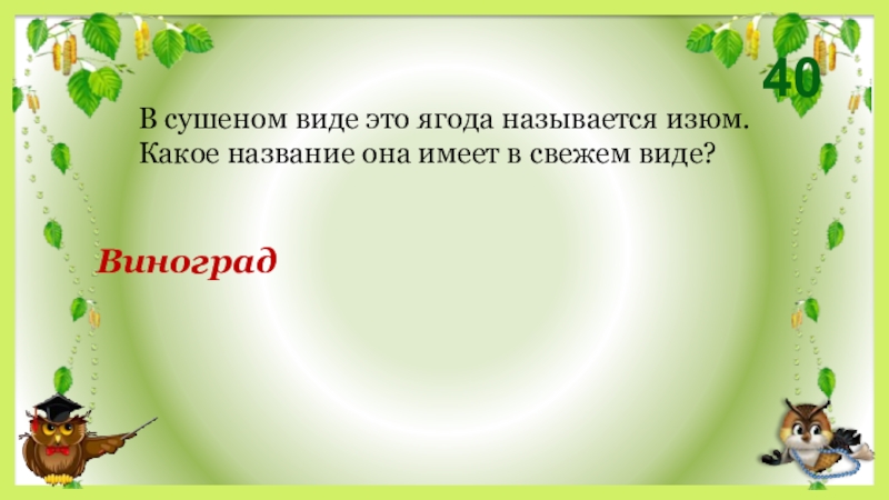 40Виноград В сушеном виде это ягода называется изюм. Какое название она имеет в свежем виде?