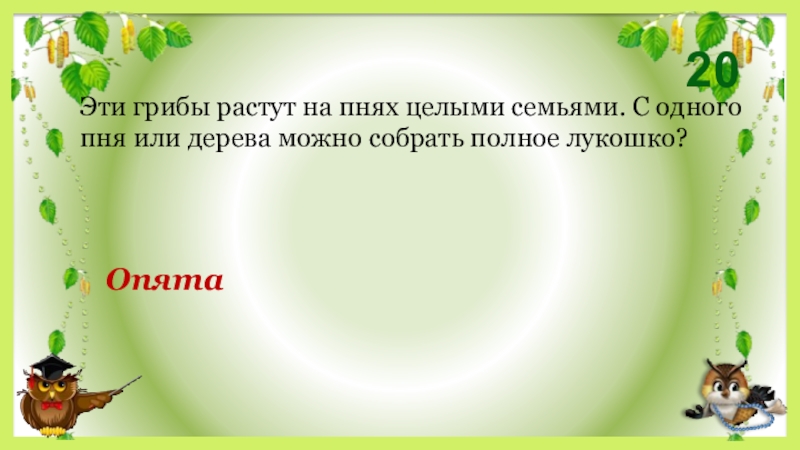 20ОпятаЭти грибы растут на пнях целыми семьями. С одного пня или дерева можно собрать полное лукошко?