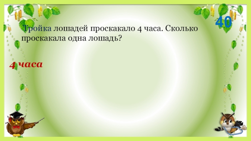 Тройка лошадей проскакало 4 часа. Сколько проскакала одна лошадь?