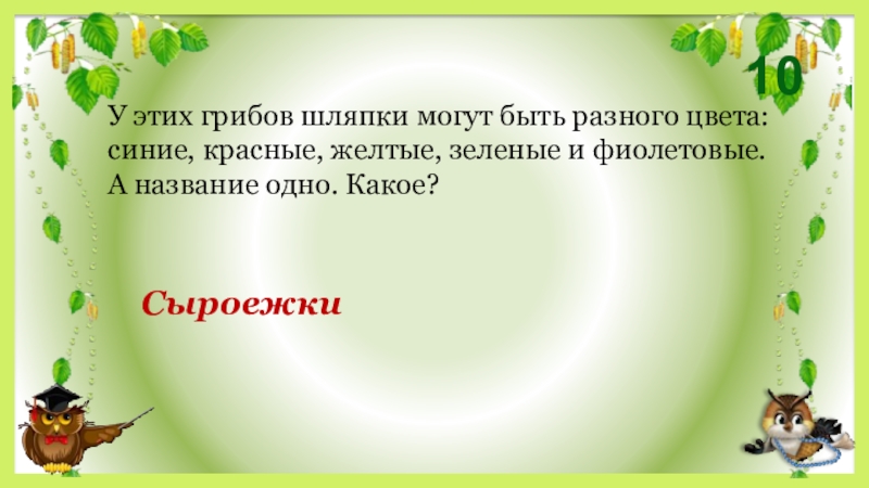 10СыроежкиУ этих грибов шляпки могут быть разного цвета: синие, красные, желтые, зеленые и фиолетовые. А название одно.