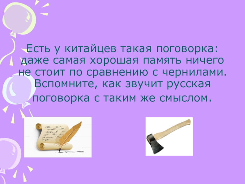 Слайд 20Есть у китайцев такая поговорка: даже самая хорошая память ничего не