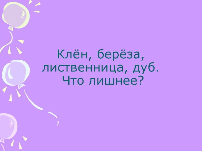 Слайд 23Клён, берёза, лиственница, дуб. Что лишнее?