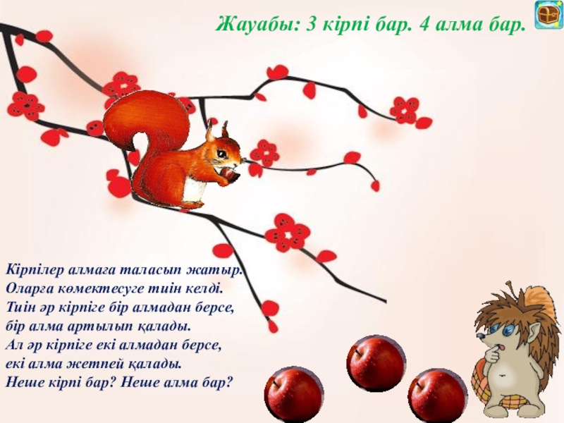 Жауабы: 3 кірпі бар. 4 алма бар.