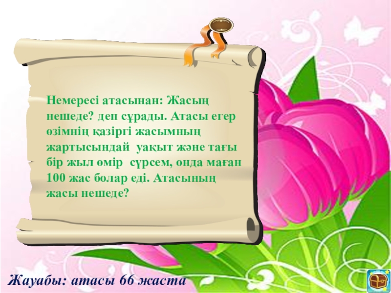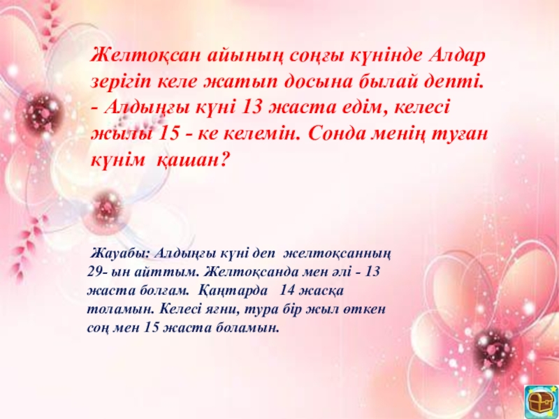 Жауабы: Алдыңғы күні деп желтоқсанның 29- ын айттым. Желтоқсанда мен әлі - 13 жаста болғам. Қаңтарда 14 жасқа толамын. Келесі яғни, тура бір жыл өткен соң мен 15 жаста боламын.