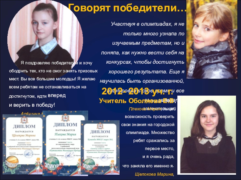 Я поздравляю победителей и хочу ободрить тех, кто не смог занять призовых мест. Вы все большие молодцы! Я желаю всем ребятам не останавливаться на достигнутом, идти вперед