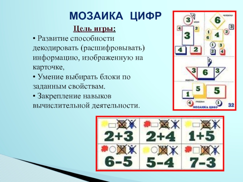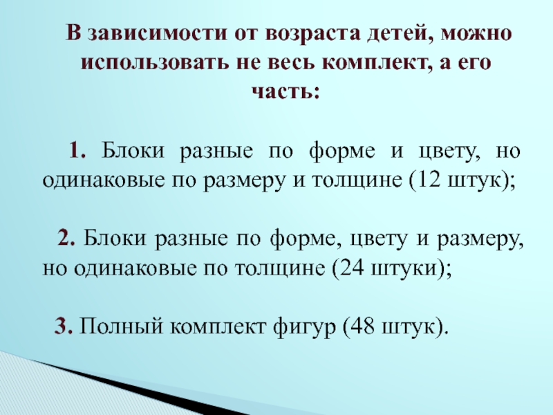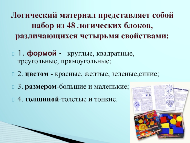 Материал: 9 комплектов логических фигур. В каждом 24 фигуры
