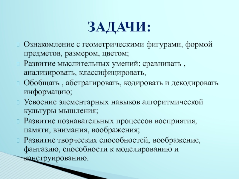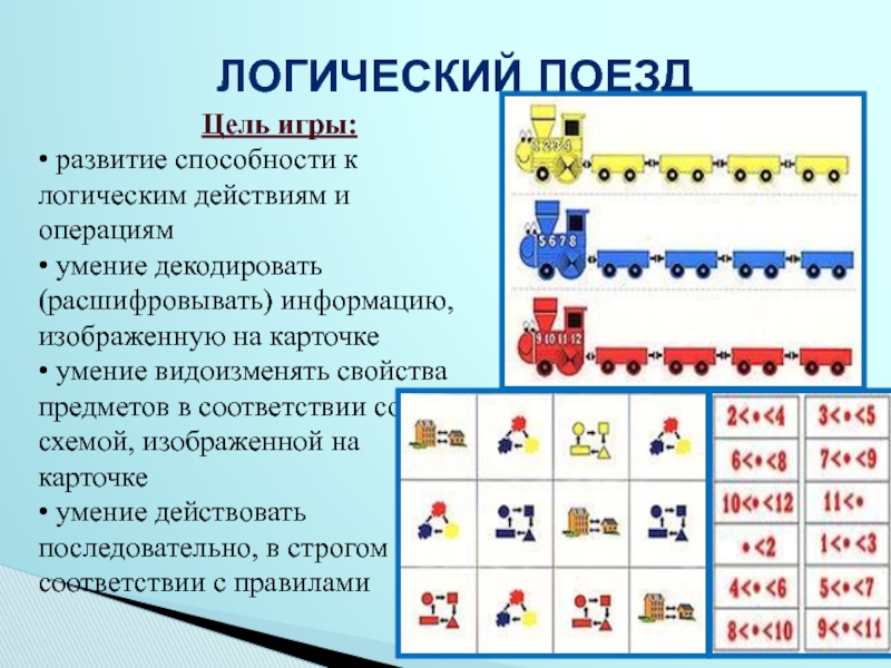 развитие способности к замещению и моделированию свойств, умение кодировать и декодировать информацию о них.