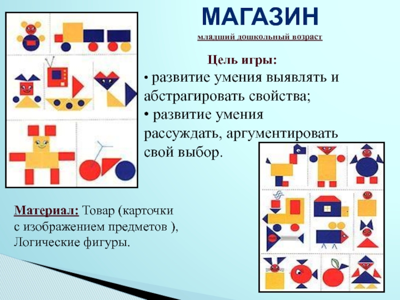 Материал: Товар (карточки с изображением предметов ), Логические фигуры.