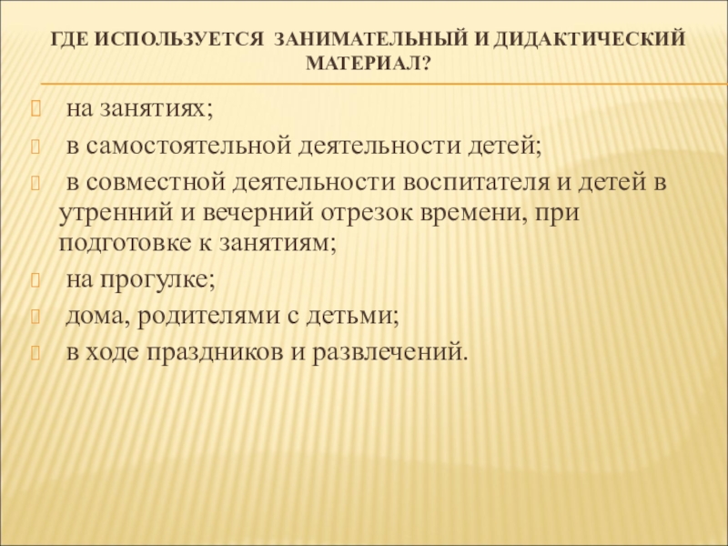 Слайд 31ГДЕ ИСПОЛЬЗУЕТСЯ ЗАНИМАТЕЛЬНЫЙ И ДИДАКТИЧЕСКИЙ МАТЕРИАЛ?