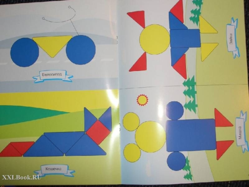 Дети осваивают алгоритм конструирования, находят спрятанные в "домике" геометрические фигуры, придумывают собственные предметные силуэты.