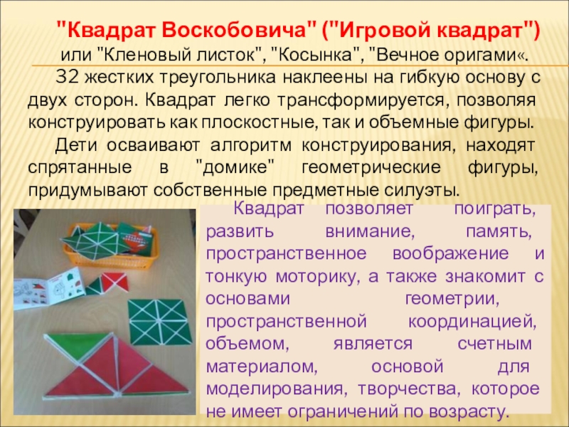 Квадрат позволяет поиграть, развить внимание, память, пространственное воображение и тонкую моторику, а также знакомит с основами геометрии, пространственной координацией, объемом, является счетным материалом, основой для моделирования, творчества, которое не имеет ограничений по возрасту.