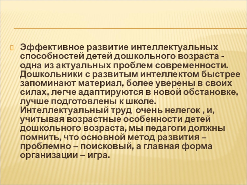 проблем современности. Дошкольники с развитым интеллектом быстрее запоминают материал, более уверены в своих силах, легче адаптируются в новой обстановке, лучше подготовлены к школе. Интеллектуальный труд очень нелегок , и, учитывая возрастные особенности детей дошкольного возраста, мы педагоги должны помнить, что основной метод развития – проблемно – поисковый, а главная форма организации – игра.