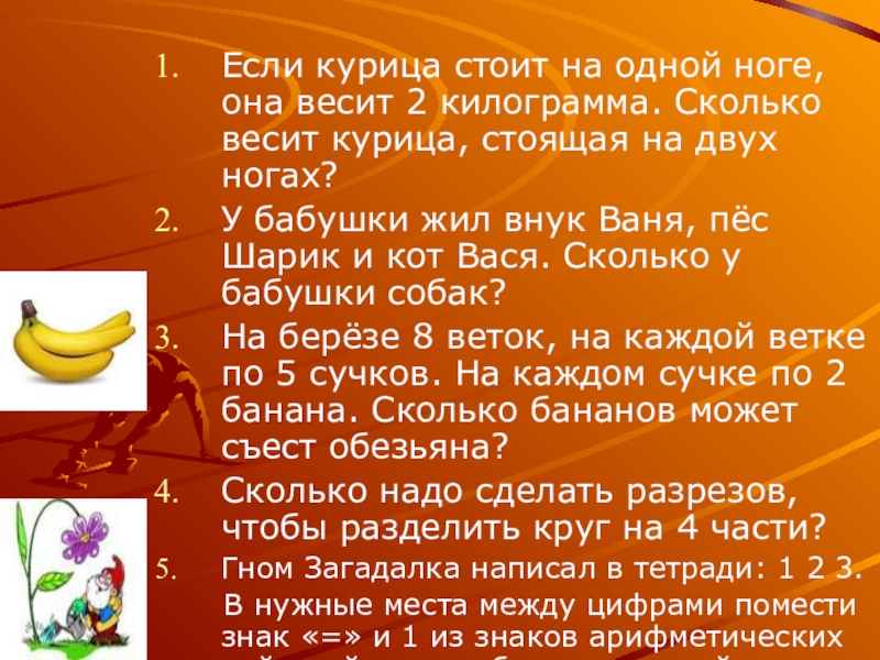 Слайд 14Если курица стоит на одной ноге, она весит 2 килограмма. Сколько