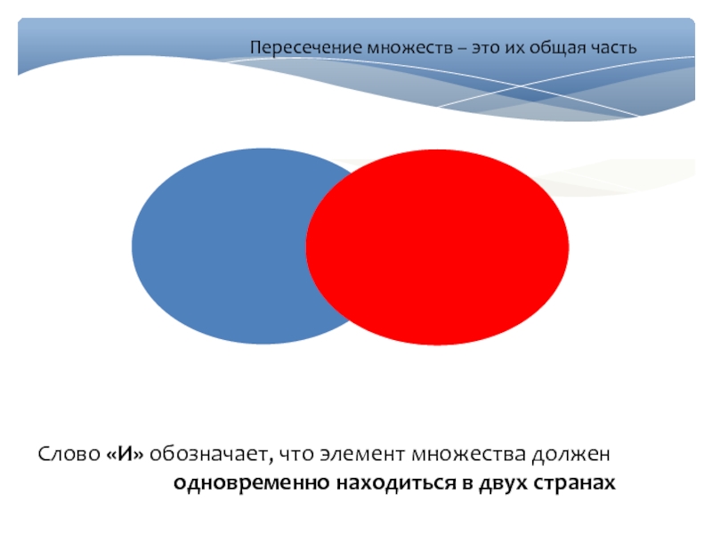 Пересечение множеств – это их общая частьСлово «И» обозначает, что элемент множества должен одновременно находиться в двух