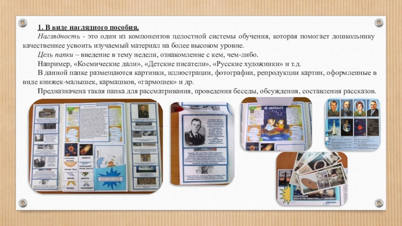 В данной папке размещаются картинки, иллюстрации, фотографии, репродукции картин, оформленные в виде книжек-малышек, кармашков, «гармошек» и др.
