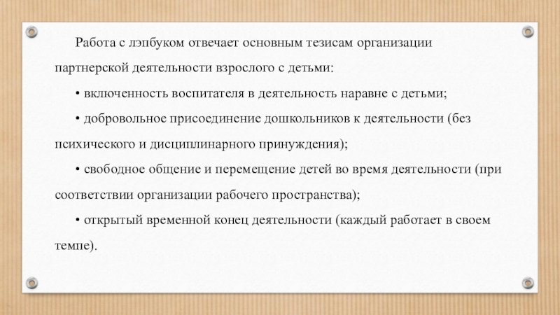 Слайд 4Работа с лэпбуком отвечает основным тезисам организации партнерской деятельности взрослого с