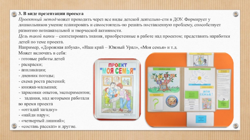 Цель такой папки – синтезировать знания, приобретенные в работе над проектом; представить наработки детей по теме проекта.