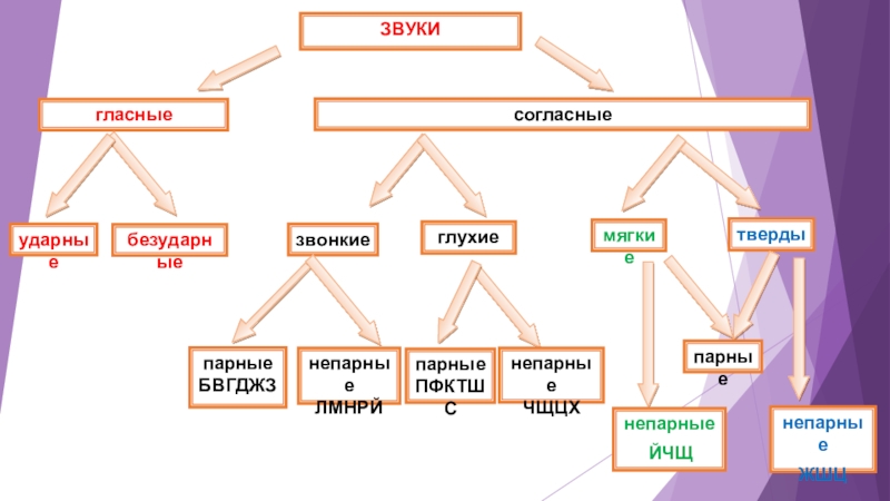 ЗВУКИгласныесогласныезвонкиеглухиемягкиетвердыеударныебезударныепарныеБВГДЖЗнепарныеЛМНРЙпарныеПФКТШСнепарныеЧЩЦХпарныенепарные ЙЧЩнепарныеЖШЦ