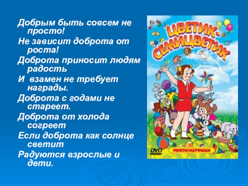 Добрым быть совсем не просто! Не зависит доброта от роста! Доброта приносит людям радость И взамен не