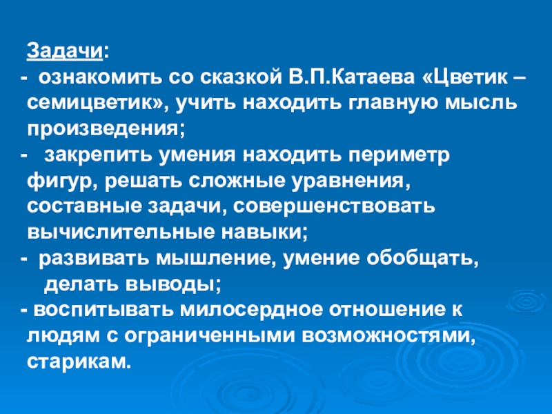 Задачи: ознакомить со сказкой В.П.Катаева «Цветик – семицветик», учить находить главную мысль произведения;  закрепить умения находить