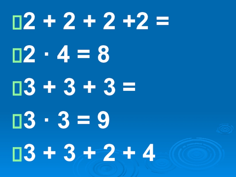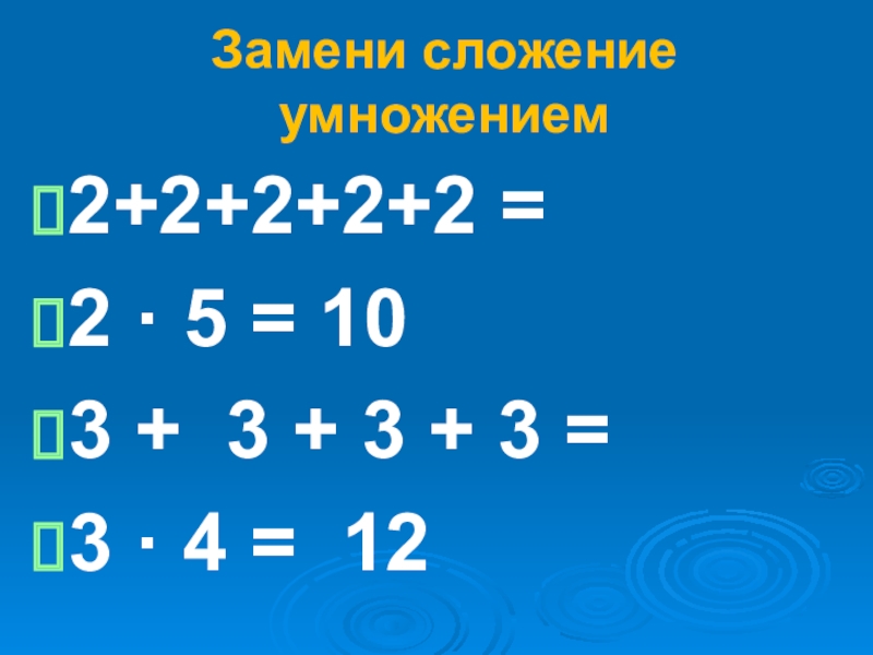 Замени сложение умножением 2+2+2+2+2 = 2 · 5 = 103 + 3 + 3 + 3 =3