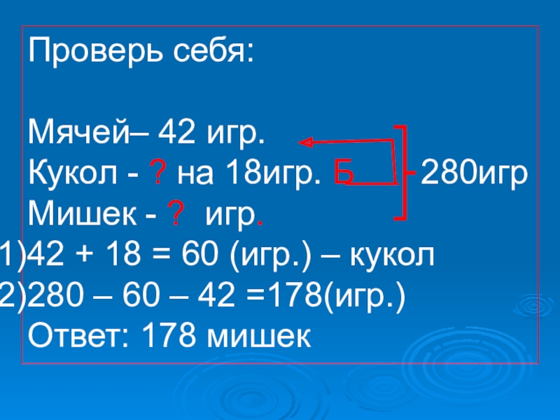 Проверь себя:Мячей– 42 игр.Кукол - ? на 18игр. Б    280игрМишек - ? игр.42 +