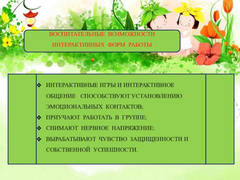 Слайд 8ИНТЕРАКТИВНЫЕ ИГРЫ И ИНТЕРАКТИВНОЕ ОБЩЕНИЕ СПОСОБСТВУЮТ УСТАНОВЛЕНИЮ ЭМОЦИОНАЛЬНЫХ КОНТАКТОВ;
