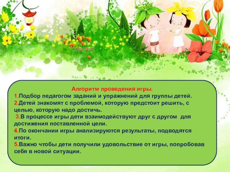 3.В процессе игры дети взаимодействуют друг с другом для достижения поставленной цели. 4.По окончании игры анализируются результаты, подводятся итоги. 5.Важно чтобы дети получили удовольствие от игры, попробовав себя в новой ситуации.
