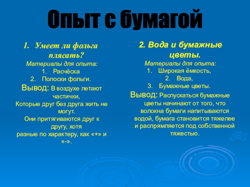 Вывод: Распускаться бумажные цветы начинают от того, что волокна бумаги напитываются водой, бумага становится тяжелее и распрямляется под собственной тяжестью.