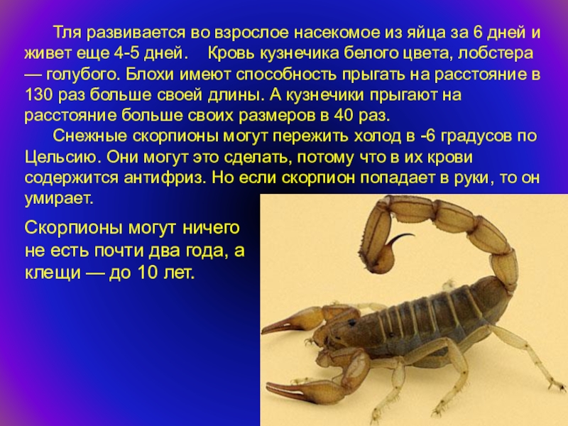 Скорпионы могут ничего не есть почти два года, а клещи — до 10 лет.