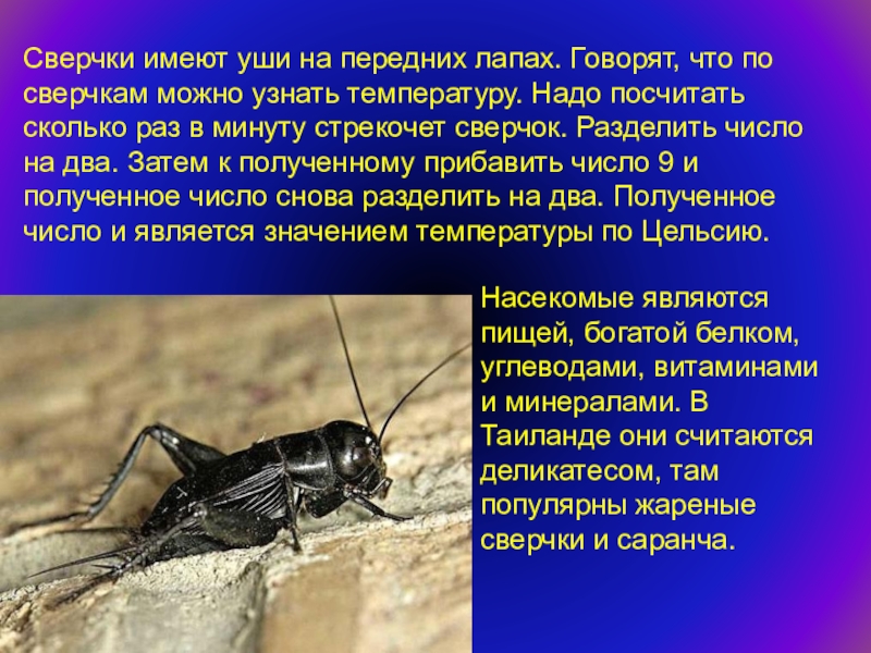 Насекомые являются пищей, богатой белком, углеводами, витаминами и минералами. В Таиланде они считаются деликатесом, там популярны жареные сверчки и саранча.