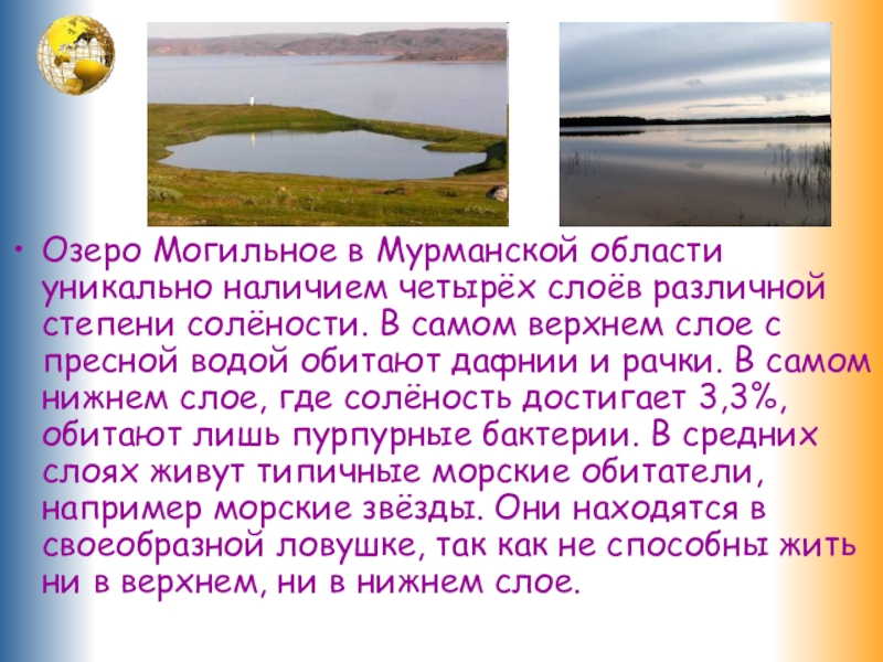 Слайд 12Озеро Могильное в Мурманской области уникально наличием четырёх слоёв различной степени