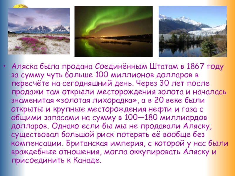 больше 100 миллионов долларов в пересчёте на сегодняшний день. Через 30 лет после продажи там открыли месторождения золота и началась знаменитая «золотая лихорадка», а в 20 веке были открыты и крупные месторождения нефти и газа с общими запасами на сумму в 100—180 миллиардов долларов. Однако если бы мы не продавали Аляску, существовал большой риск потерять её вообще без компенсации. Британская империя, с которой у нас были враждебные отношения, могла оккупировать Аляску и присоединить к Канаде.