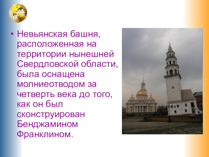 Слайд 18Невьянская башня, расположенная на территории нынешней Свердловской области, была оснащена молниеотводом